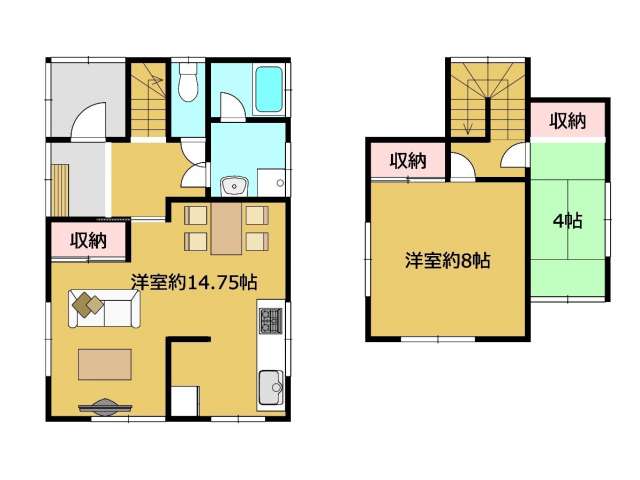 | 詳細間取 | 1SLDK (2階:洋8帖×1、1階:LDK14.75帖、サービスルーム4帖) | ||