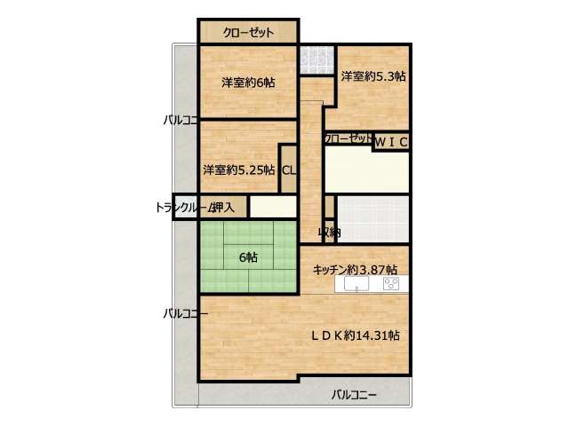 | 詳細間取 | 4LDK (和6帖×1、洋5.23帖×1、洋5.3帖×1、洋6帖×1、LDK14.31帖) | ||
