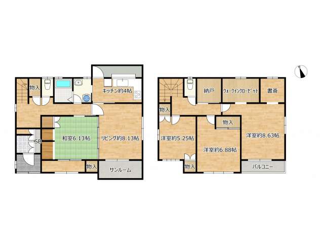 | 詳細間取 | 4SLDK (1階:和6.13帖×1、2階:洋5.25帖×1、2階:洋6.88帖×1、2階:洋8.63帖×1、LDK12.13帖、サービスルーム) | ||
