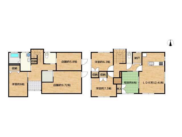 | 詳細間取 | 6LDK (1階:洋5.8帖×1、1階:洋6帖×1、1階:洋9.72帖×1、2階:和6帖×1、2階:洋6.3帖×1、2階:洋7.5帖×1、2階:LDK12.41帖) | ||