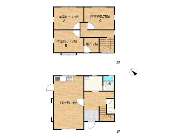 | 詳細間取 | 3LDK (2階:洋5.75帖×3、1階:LDK14帖) | ||