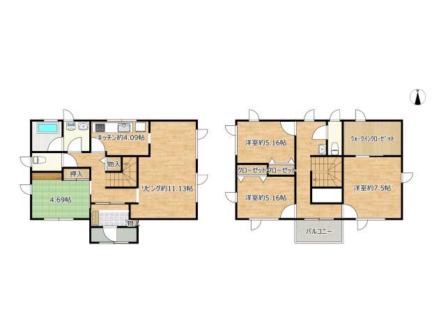 | 詳細間取 | 4LDK (1階:和4.69帖×1、2階:洋5.16帖×2、2階:洋7.5帖×1、1階:LDK15.22帖) | ||