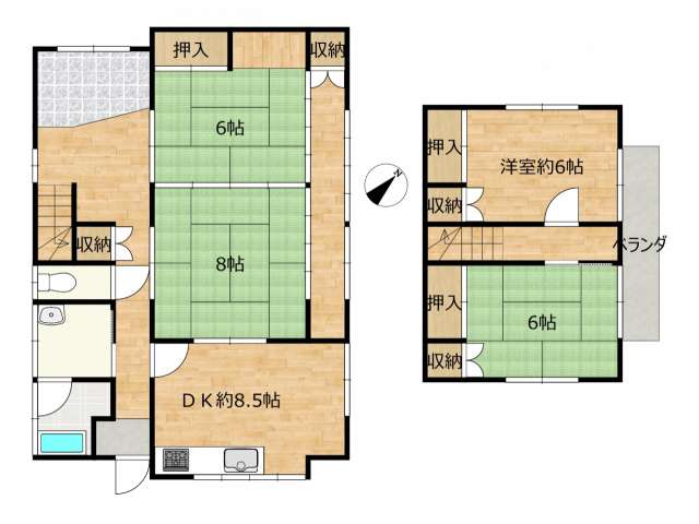 | 詳細間取 | 4DK (1階:和6帖×1、1階:和8帖×1、2階:洋6帖×1、2階:和6帖×1、1階:DK8.5帖) | ||