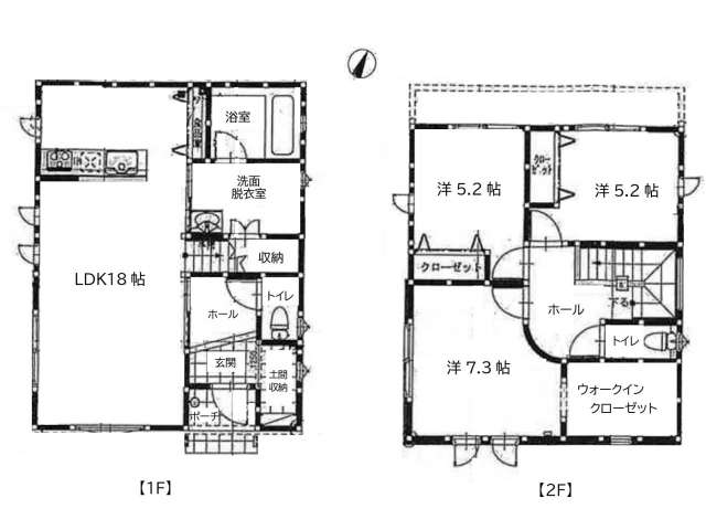 | 詳細間取 | 3LDK (2階:洋5.2帖×2、2階:洋7.3帖×1、1階:LDK18帖) | ||