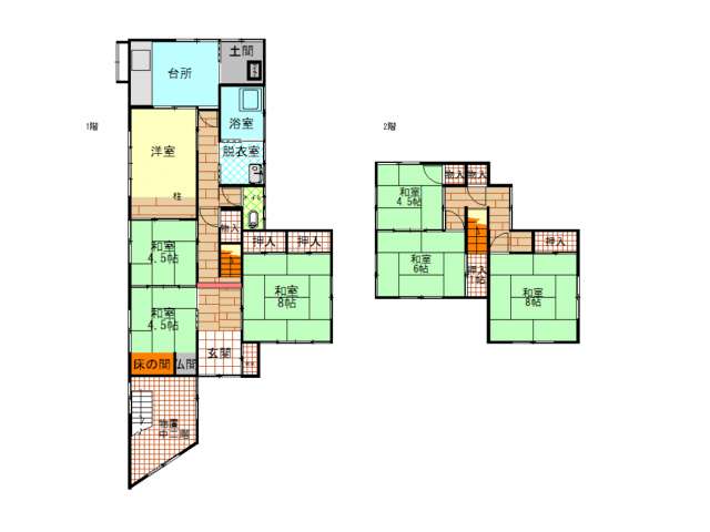 | 詳細間取 | 7DK (1階:和8帖×1、1階:和4.5帖×2、1階:帖×1、2階:和8帖×1、2階:和6帖×1、2階:和4.5帖×1) | ||