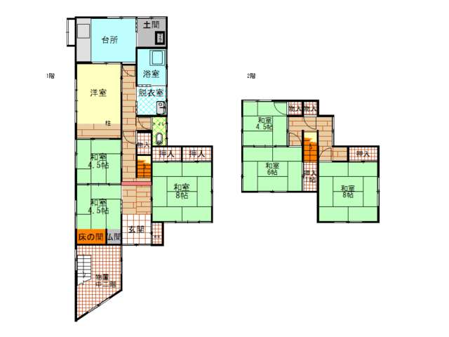 | 詳細間取 | 7DK (1階:和4.5帖×2、1階:和8帖×1、1階:帖×1、2階:和4.5帖×1、2階:和6帖×1、2階:和8帖×1) | ||
