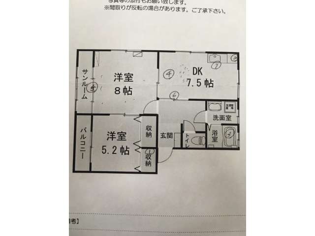 | 詳細間取 | 2DK (洋8帖×1、洋5.2帖×1、DK7.5帖) | ||