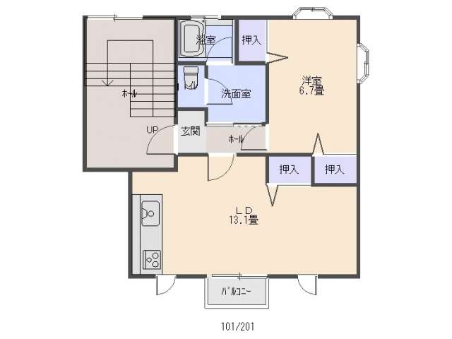 | 詳細間取 | 1LDK (洋6.7帖×1、LDK13.1帖) | ||