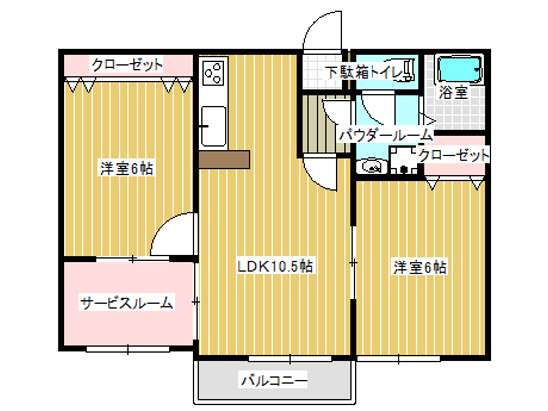 | 詳細間取 | 2SLDK (洋6帖×2、LDK10.5帖、サービスルーム3帖) | ||