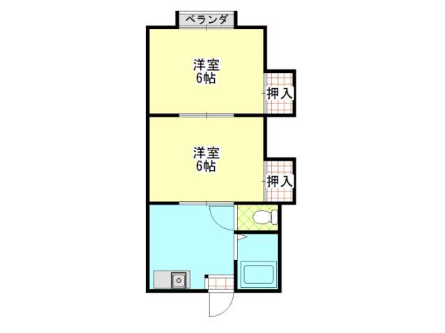 | 詳細間取 | 2K (洋6帖×1、洋6帖×1、キッチン4.5帖) | ||