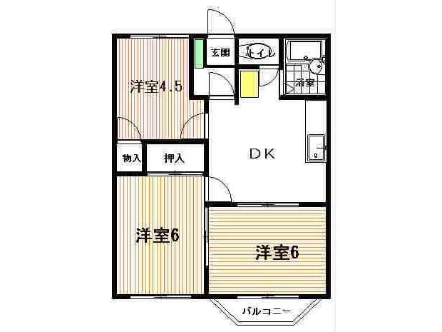 | 詳細間取 | 3DK (洋6帖×2、洋4.5帖×1、DK6帖) | ||