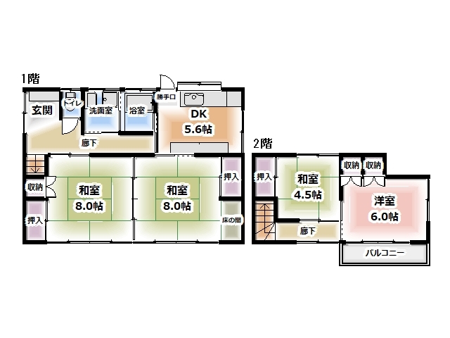 | 詳細間取 | 4DK (1階:和8帖×2、1階:和4.5帖×1、1階:洋6帖×1、1階:DK5.6帖) | ||
