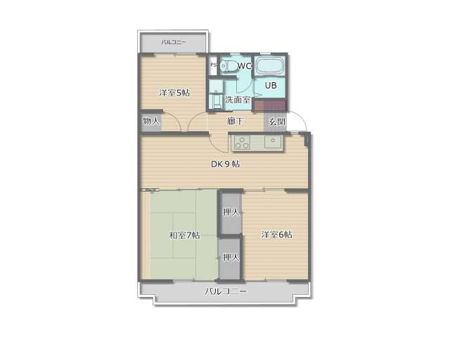 | 詳細間取 | 3DK (和7帖×1、洋6帖×1、洋5帖×1、DK9帖) | ||