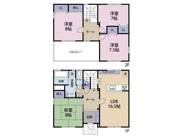 | 詳細間取 | 4LDK (1階:和8帖×1、2階:洋8帖×1、2階:洋7.5帖×1、2階:7帖×1、1階:LDK16.5帖) | ||